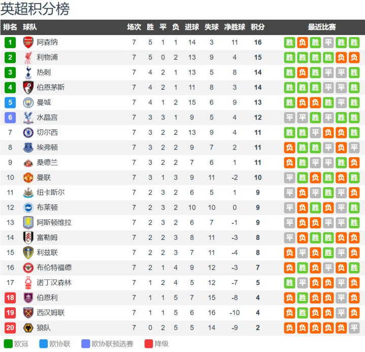 英超第7轮战罢,联赛暂时休整,进入10月份的国际比赛日。你能想得到吗?英超第7轮,big6球队唯独利物浦输球还丢掉了榜首,阿森纳登顶,热刺升至第三,曼城升至第五,切尔西排名第七,曼联排名第十。